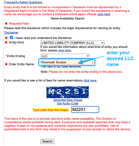 - Access the tool: Go to Delaware’s Name Availability Search page