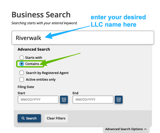 Why “Contains” is essential: If you search “Mountain Consulting” with “Starts With,” you’ll miss “The Mountain Consulting Group Inc.”—and that existing business prevents you from using “Mountain Consulting LLC.”
