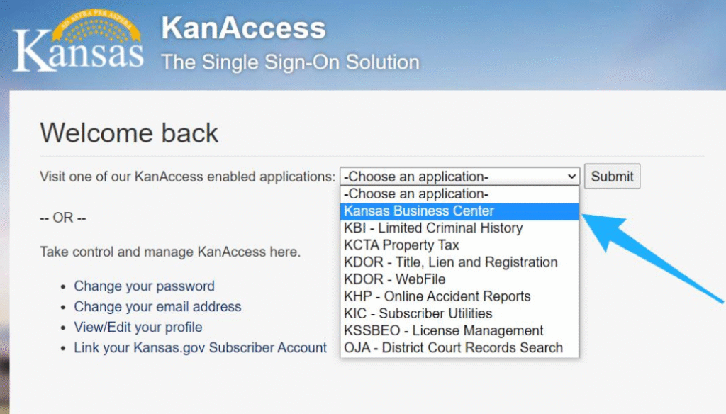 4. Select “Kansas Business Center” from the dropdown