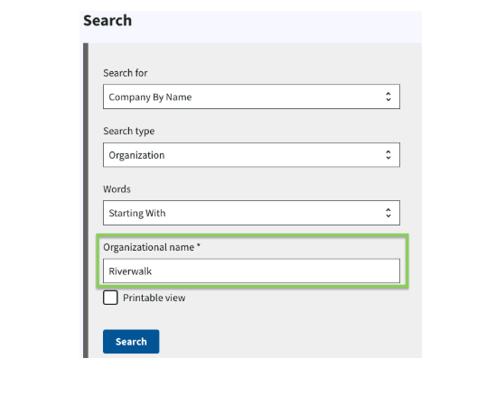 Example: For “Blue Ridge Consulting Solutions LLC,” search “Blue Ridge Consulting Solutions”