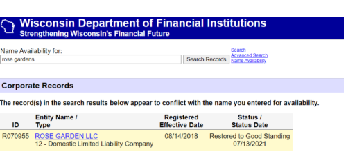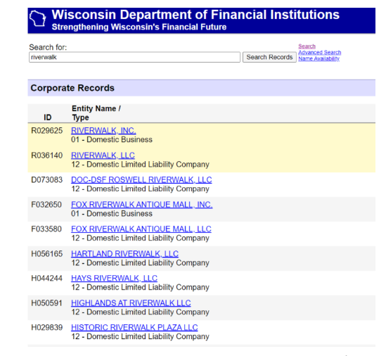 Access: Wisconsin Department of Financial Institutions Corporate Records Search