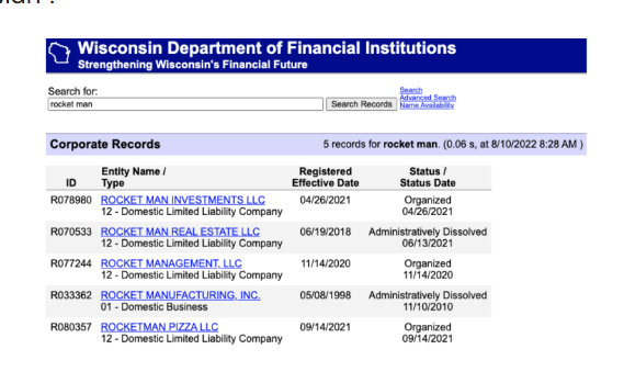 Example from Wisconsin: “Rocket Man LLC” showed different results in each tool, but DFI confirmed it would likely be approved because existing businesses used additional distinguishing words.